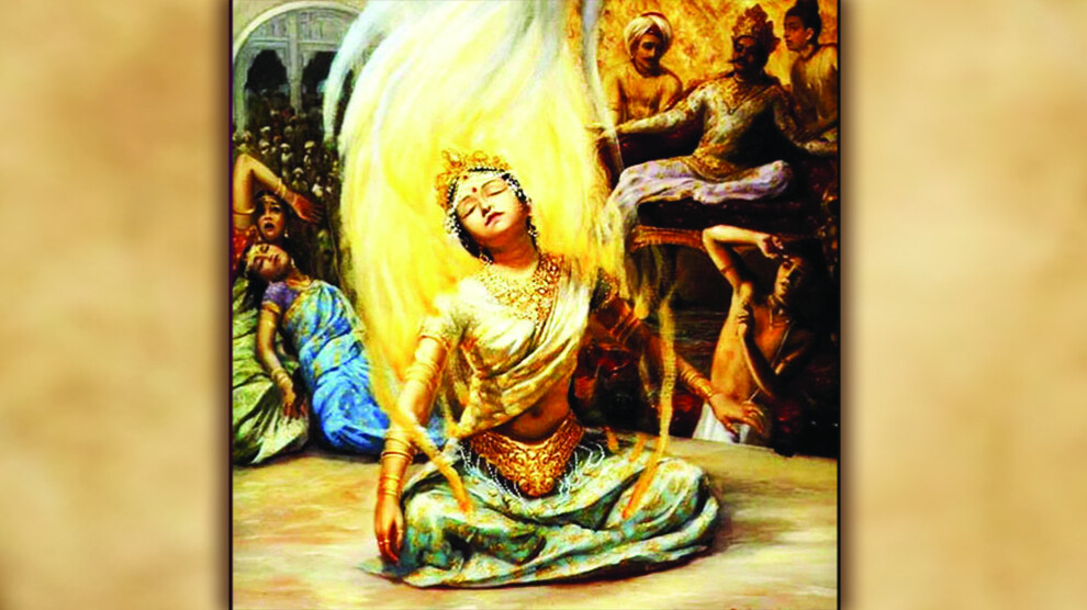 ساتی کە بە ڕێکەوت گوێی لە ڕێوڕەسمەکە بوو، تووڕە بوو لەوەی کە باوکی ئەوانی پەراوێزکرووە، چوو بۆ شوێنی ڕێوڕەسمەکە. بەپێی ئەفسانەکە، ساتی هێندە خۆی نوقمی ڕێوڕەسمی قوربانیدان کرد کە چووە ناو یۆگاوە و هەر نۆ دەرگای هەستەکانی لە جەستەیدا داخست، وەستا لە هەناسەدان و دوای ماوەیەک جەستەی لە ناو ئاگردا سووتا. بەپێی هەندێک گێڕانەوە، ساتی خۆی فڕێدایە ناو ئاگری قوربانیدانەکە وەک ناڕەزایی دەربڕین بەرامبەر باوکی و بۆ سزادانی ترسنۆکی هاوسەرەکەی شیڤا. لە بنەڕەتدا، ئەمە جەنگی دەسەڵات بوو لە نێوان خوداکاندا.