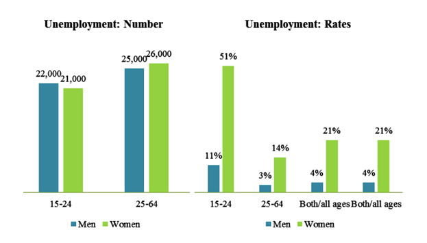((هێڵکاریی ژمارە ٢: ڕێژەی بێکاری و بڕی بێکاریی ژن و پیاو[60]))